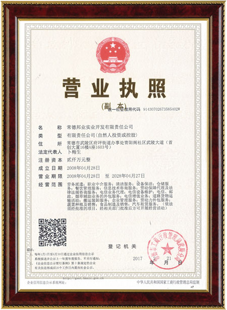 常德邦業(yè)實(shí)業(yè)開發(fā)有限責(zé)任公司(原名常德市邦業(yè)人力資源開發(fā)有限責(zé)任公司)是經(jīng)湖南省人力資源和社會保障廳核準(zhǔn)備案,常德市人力資源和社會保障局批準(zhǔn),常德市工商行政管理局登記注冊的一家綜合性人力資源服務(wù)型企業(yè)。公司成立于2008年4月28日,注冊資本2000萬元。